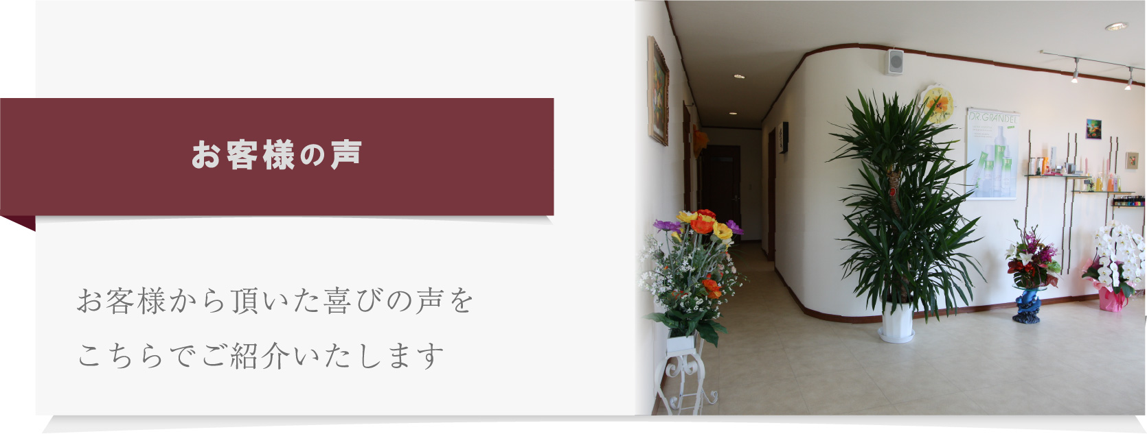 お客様からのお喜びの声、本当にありがとうございます。 これからも、お客様のご意見に耳をかたむけより満足いただけるエステサロンを目指します。スタッフ一同